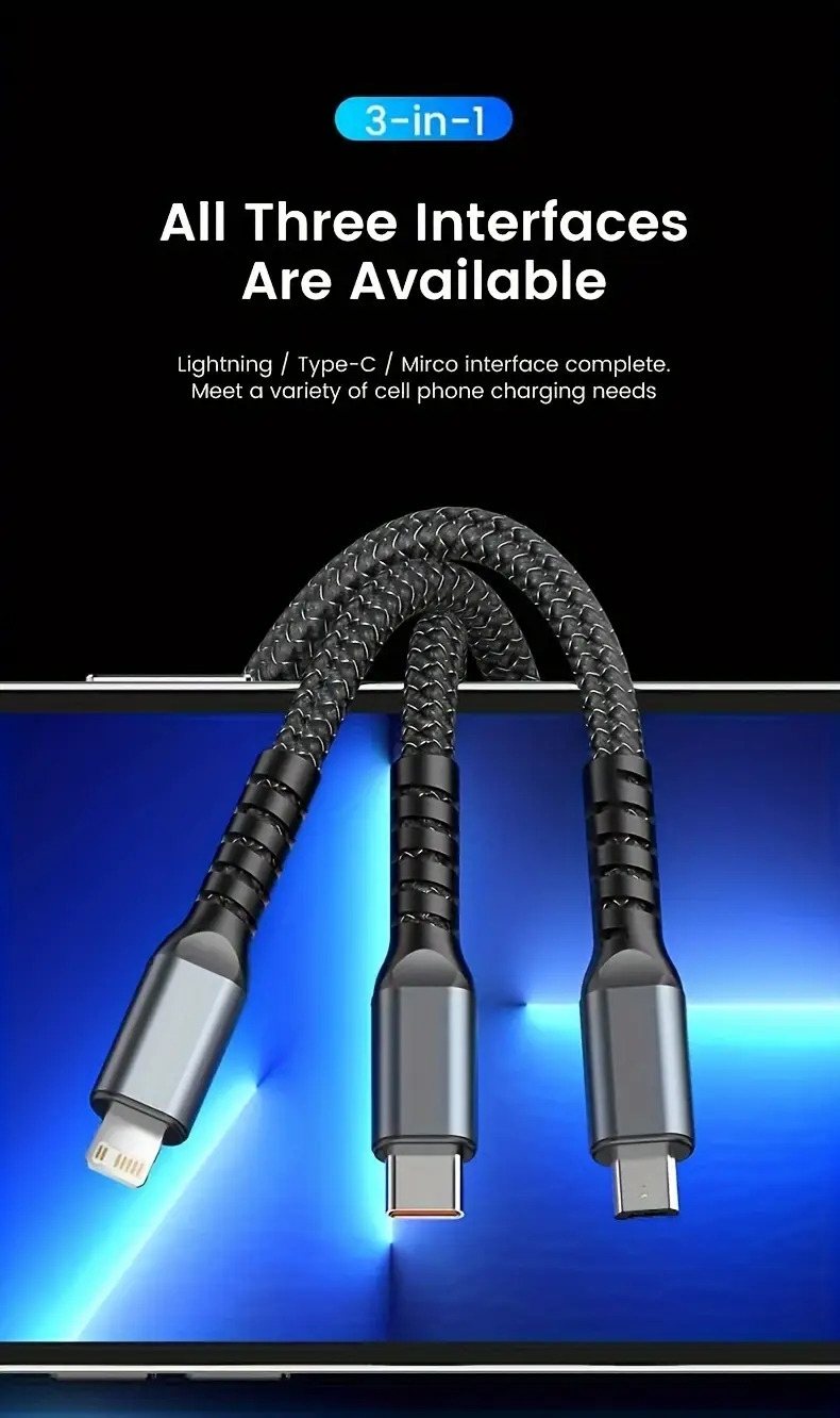 Câble de Charge 3-en-1 – Puissance 100W Charge Rapide