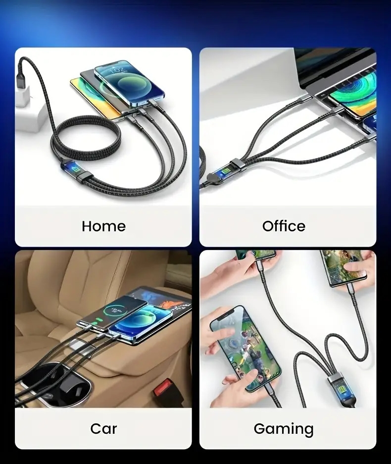 ✔️ Il intègre trois connecteurs (Type-C, Micro-USB, Lightning), ce qui le rend universel et pratique pour tous vos appareils.